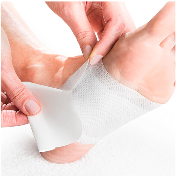贴片贴在双脚中间。贴片柔软的一面要接触皮肤。